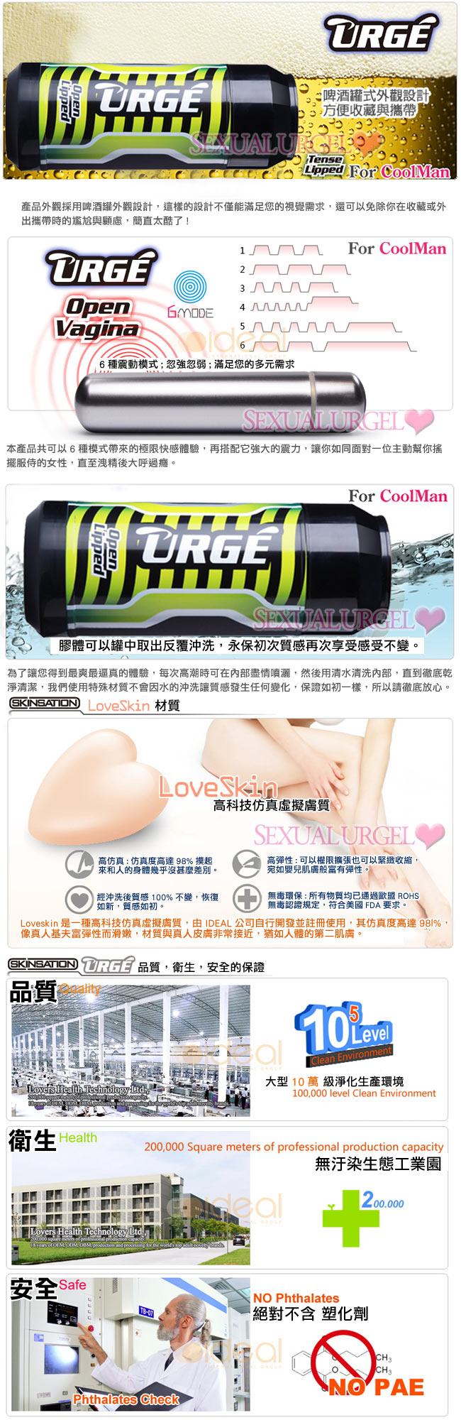 啤酒罐系列產品全部採用觸感極好的Loveskin™超擬真材料,超擬真材質是美國SkinSation專用的新型材料,特點是無毒無異味、環保、柔軟、有彈性。與普通硅膠、PVC塑膠相比,具有不粘手、彈性更佳、不易開裂、更耐用、觸感更真實的優點。