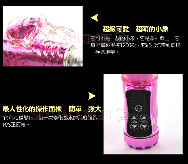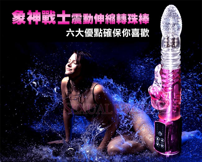 最新強力電動伸縮按摩棒,可同時震動陰道、陰核,震動力強勁!耐用、耐操,同時可震動,遠遠超越了男性陽具所能發揮的體能極限,強烈的戳幹力,幾乎讓人無法一手掌握,再怎麼強烈的燎原慾火,也會被它所撲滅夷平。中間的環紋部分不停地伸縮、抽動,在您的私處進出、摩擦;小象長長的鼻子拍打、添吸著您最敏感的陰蒂……