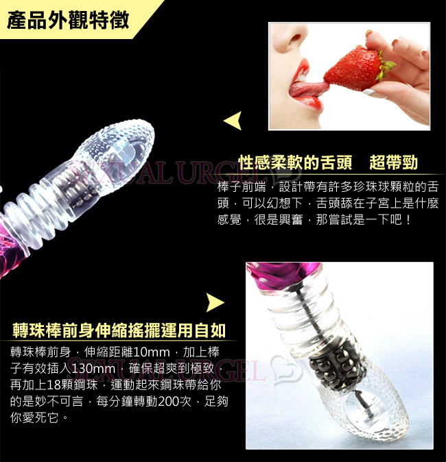 .360度旋轉,頭部及18顆鋼珠可由慢到快轉動,增加妳的酸軟感。