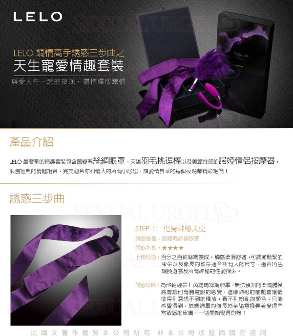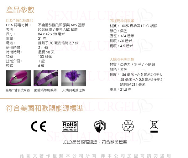 用LELO這一最奢華的情趣套裝盡情挖掘感官的所有潛能。所包含的茵緹瑪絲綢眼罩與天嬌羽毛挑逗棒將啟發您的無限激情,令您在全身細胞都歡樂得無法言喻時,與您的情侶充分體驗諾婭情侶按摩器帶來的全新激情感覺。做愛時諾婭TM由女性佩戴,雙方共用歡樂與舒適,前戲與高潮完美銜接,每時每刻都精彩絕倫!