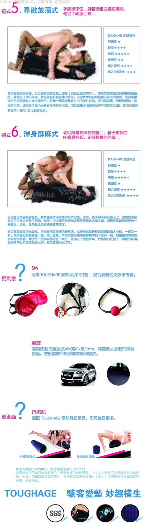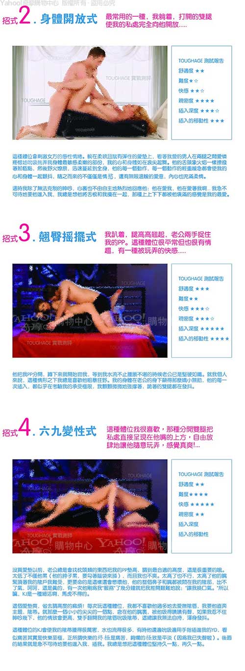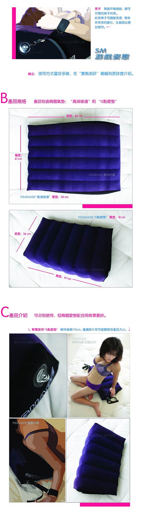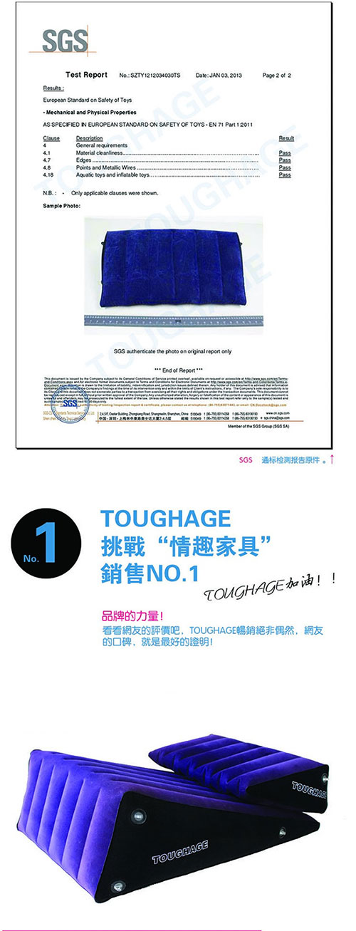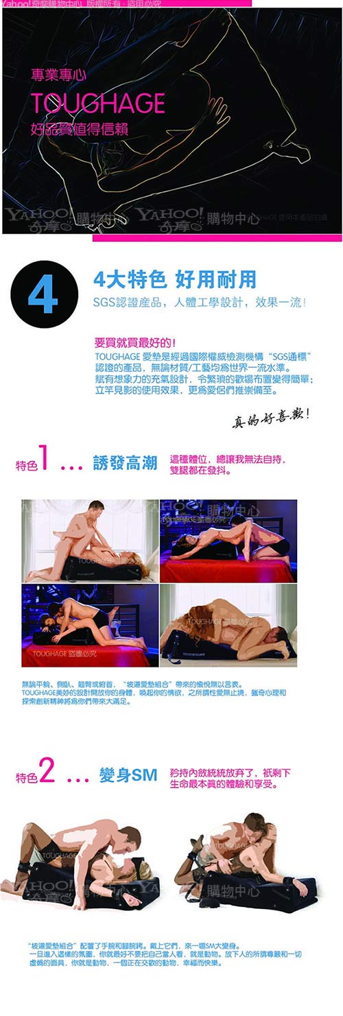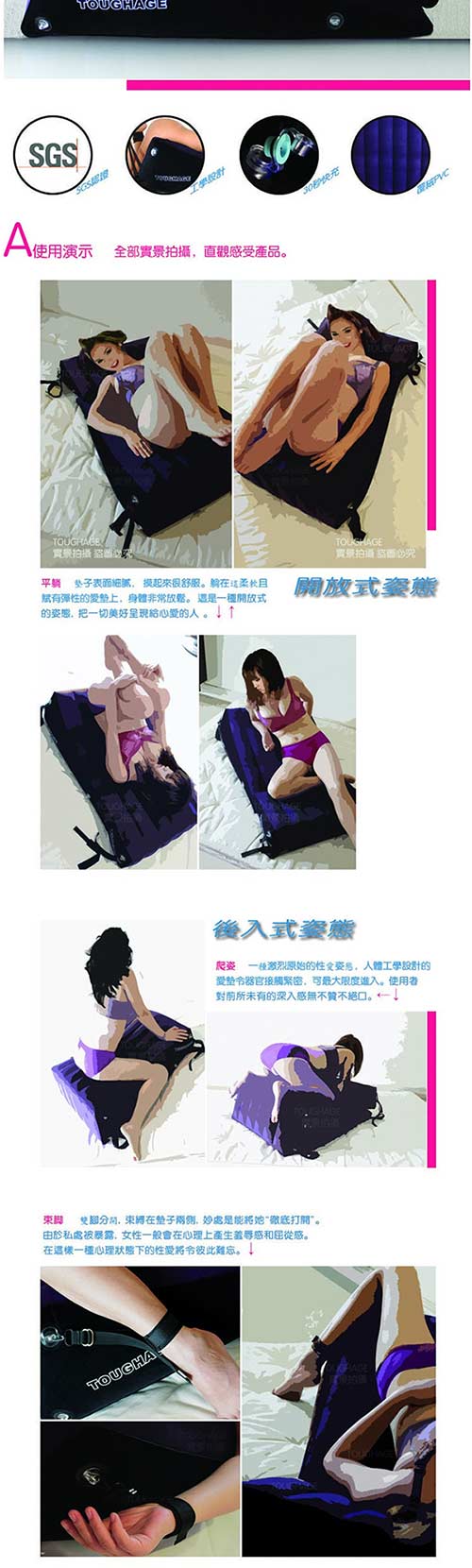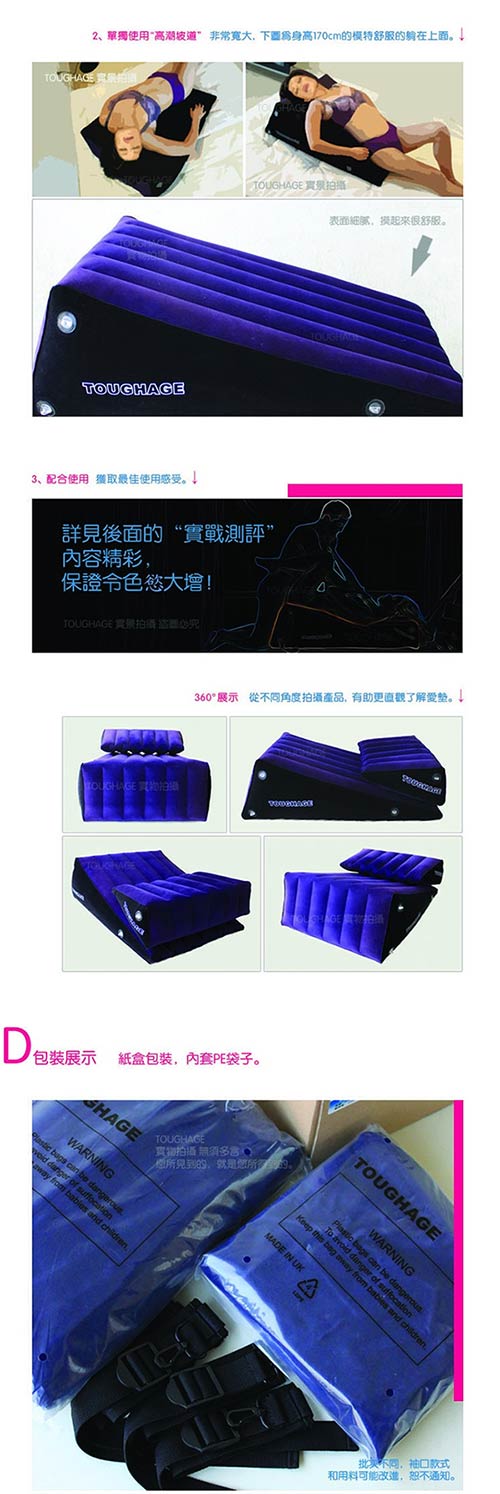 無論平躺、側臥、翹臀或俯首,「坡道愛墊組合」帶來的愉悅無以言表。 TOUGHAGE美妙的設計開放你的身體,喚起你的情慾,之所謂性愛無止境,獵奇心理和 探索創新精神將為你們帶來大滿足!