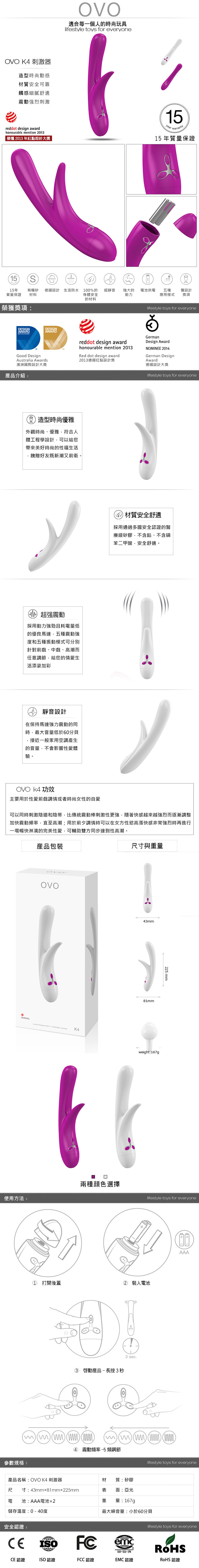 .主商品:德國OVO-K4 喬伊斯 5段變頻 多功能 雙叉 震動按摩棒-桃紅色X1