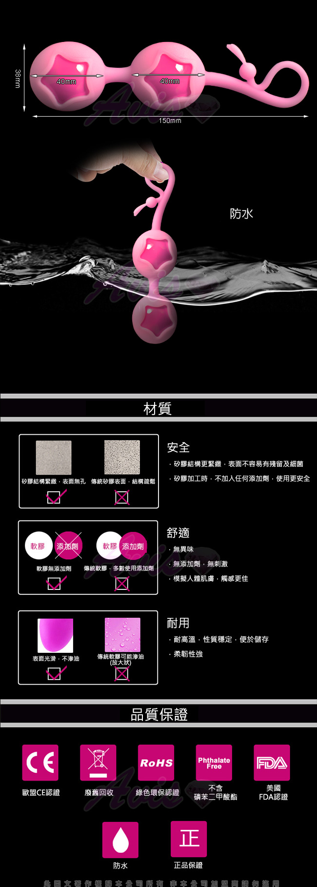 聰明球球是用安全材質製成。它們是極度強韌耐用,而且容易清洗保養的,可以連續被放置在陰道內好幾個小時。色彩繽紛的外在和光滑的表面是視覺和触覺上的享受。專利特殊設計讓它即使在跳動的狀態也是非常安靜。這些聰明的特色,讓聰明球球成為世界上最受歡迎的女性玩具,也是最讓男人迷惘、讓女人心跳加速的女性娛樂。 (不需使用電池)