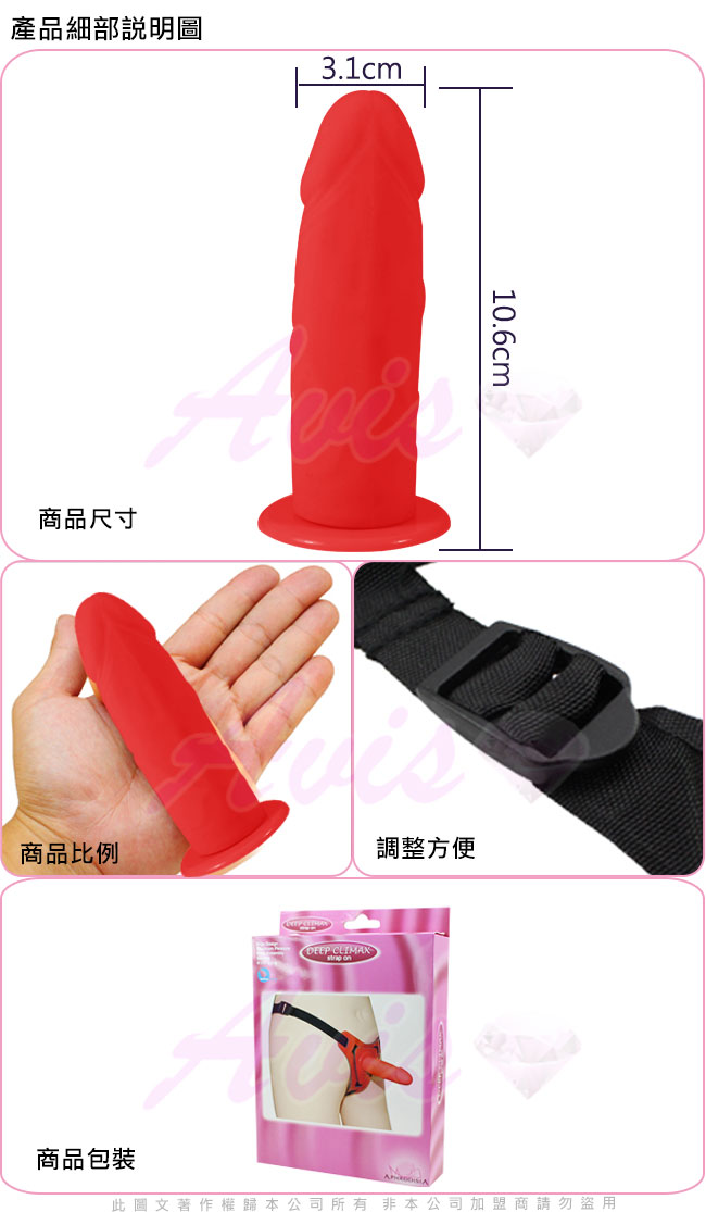 .商品名稱:APHRODISIA 活潑小弟弟 穿戴逼真型按摩棒-紅(可拆下單獨使用) *1