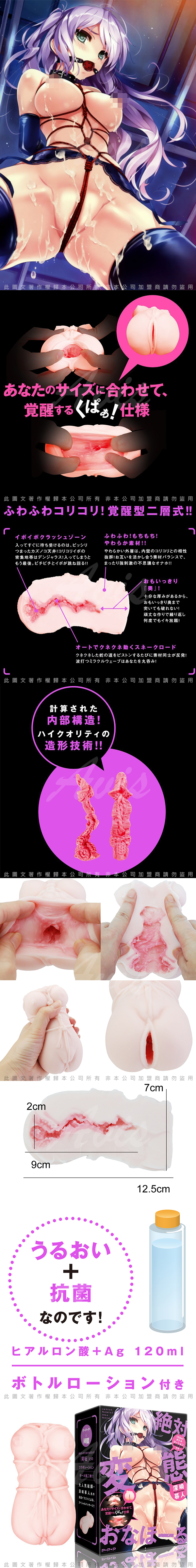 軟嫩清脆的覺醒型雙層式!大小尺寸剛剛好的中型自慰器。表面清爽Q彈。內部為清脆粘膜刺激的真實雙層構造!插入口是能「啪!」的服貼任何尺寸的覺醒型!高品質的造型技術經過不斷計算打造出的內部構造!找不到任何缺點的最強自慰器誕生!付120ml瓶裝潤滑液。插畫家:深崎暮人