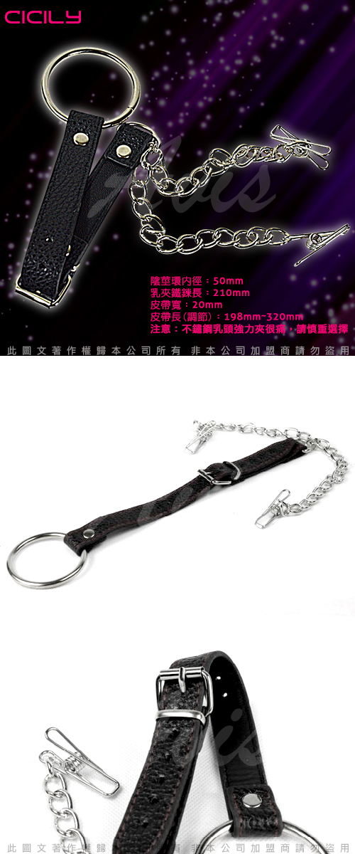 .商品尺寸:陰莖環內徑50mm;乳夾鐵鍊長210mm;皮帶寬20mm;皮帶長(調節)198mm-320mm