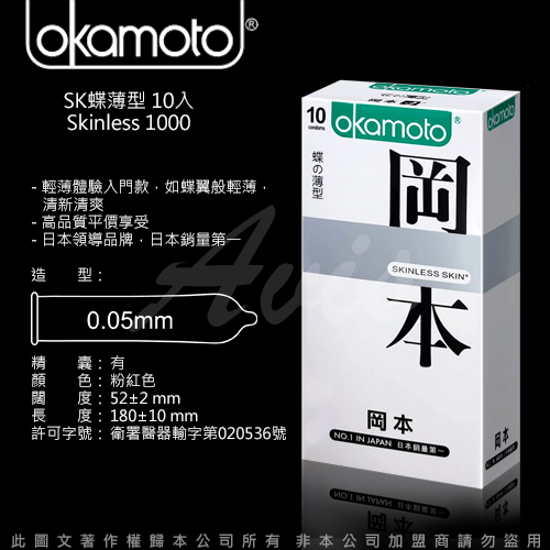品名:Okamoto岡本 Skinless Skin 蝶薄型保險套(10入裝)