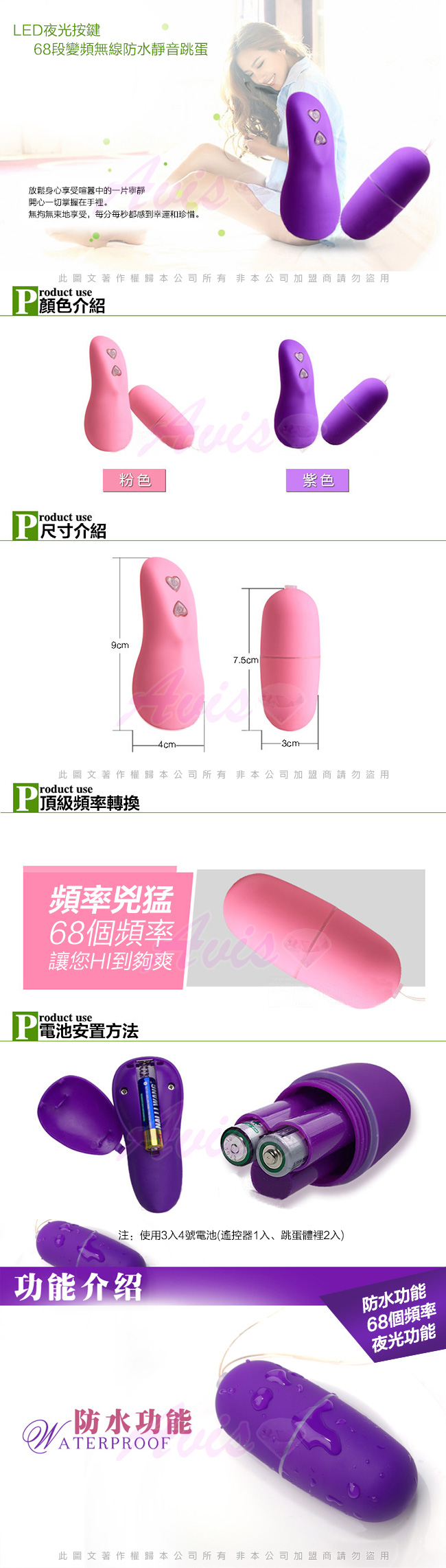 .商品名稱:夜光媚影-LED夜光按鍵68段變頻無線防水靜音跳蛋-紫   *1