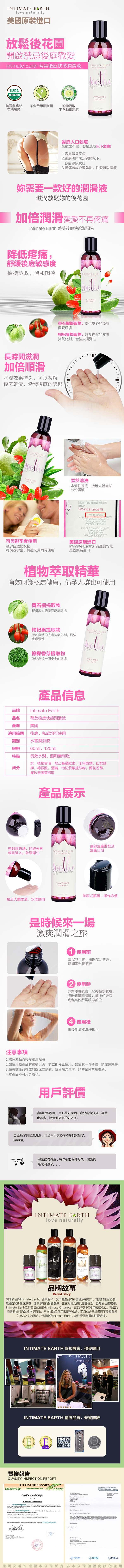 INTIMATE-EARTH的潤滑液混合物含有經過認證的的純天然蘆薈,番石榴提取物,枸杞提取物,完全純天然成份。