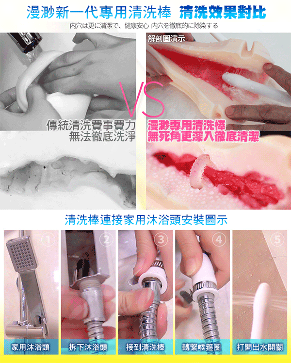 只需接上自來水即可非常方便地對情趣用品穴內進行徹底清潔。能有效防止污漬、細菌等殘留易變質物對身體造成潛在危害,進而影響您的身體健康。