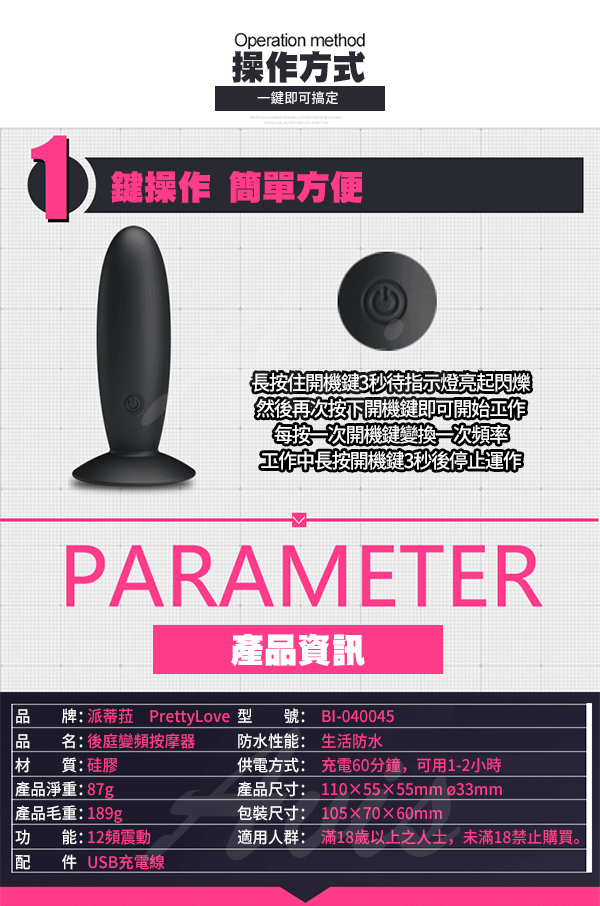 .商品名稱:PRETTY LOVE-愉悅後庭 12段變頻震動USB充電吸盤後庭棒