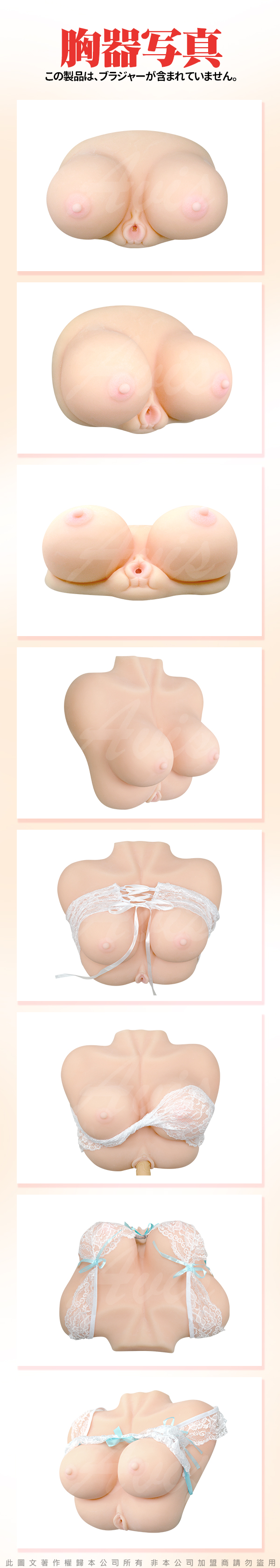 吹彈可破的肌膚,豐盈白嫩的雙乳正期盼著你的採集,乳頭是相當粉嫩真實的粉紅色,仿真度高,柔軟的感覺近乎真實,彈性十足。只有真正的接觸,才能感覺到它的不同,只要雙手輕輕一夾,再加上幻想,必定達到真實乳交的感覺,真的會讓人忍不住去挑逗她親她,比真胸玩起來還爽!盡情的搓揉吧!夾吸吧!!