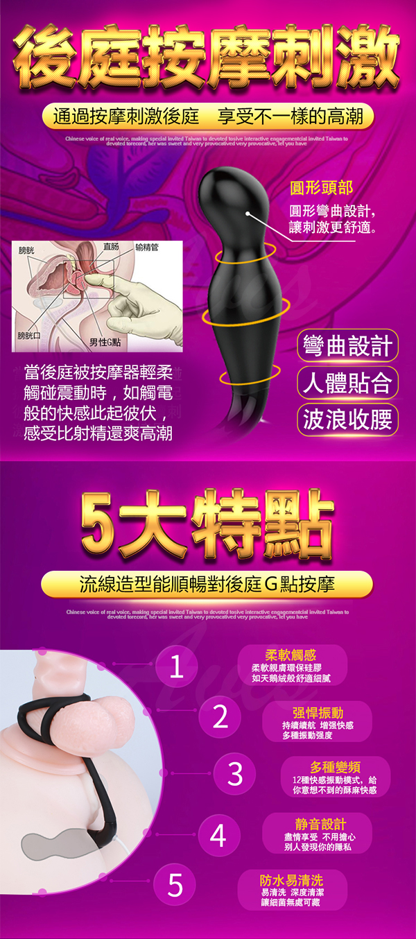 鎖陽電動前列線刺激器震出您激情快感,鎖陽束精使用三重鎖陽鎖根固蛋減緩您血液回流速度使老二上翹堅挺!後庭按摩貼合的黃金彎曲設計輕鬆刺激您的前列線讓高潮更舒適讓您進入另一種境界。搭配強悍的12段持續震動快感模式增強您的快感享受給您意想不到的酥麻享受。採用如天鵝絨般舒適細膩的環保矽膠讓您放心使用,更有貼心的靜音防水功能讓您不論在哪都能盡情解放您的慾望!