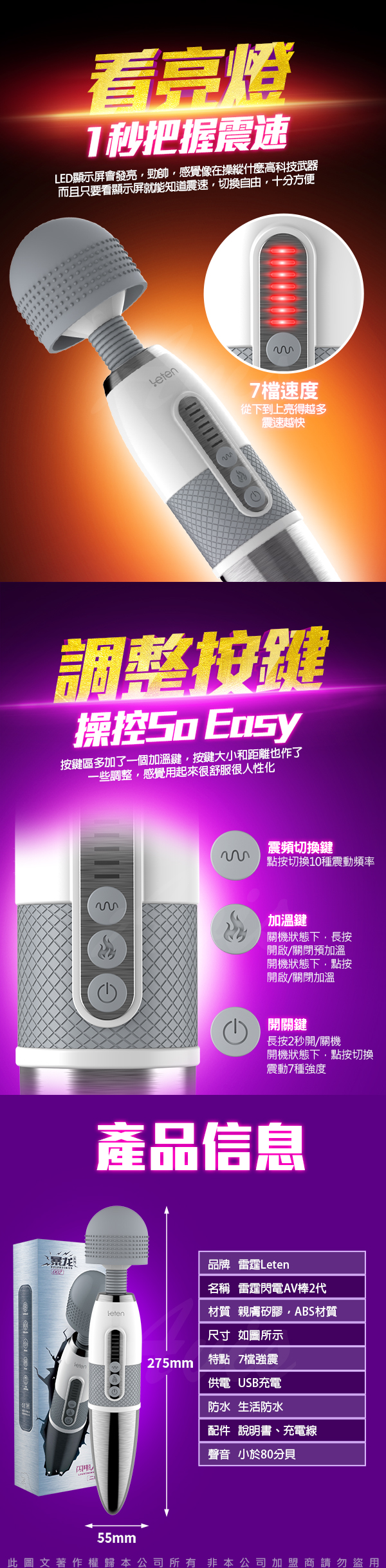 .主商品:LETEN 閃電二代 7段變頻 高潮AV女優按摩棒 加溫款