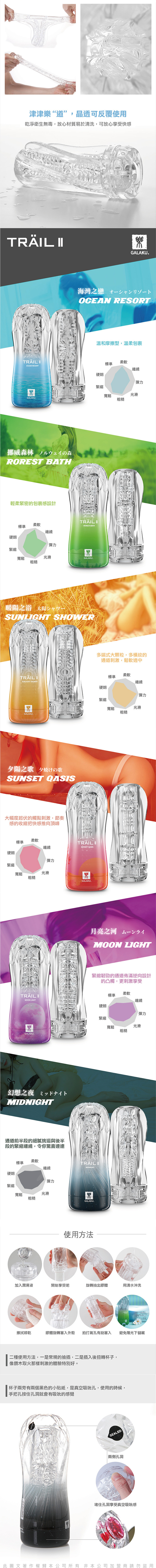 TRAIL II 自慰訓練器體驗1~6階帶您通往快感天堂的飛機杯,全採用透明膠體更柔軟更安全,並且可重覆使用方便清洗!採真空吸吮真實還原如少女般的肉感通道與紋理其中海灣藍、森林綠為柔軟型,柔軟的材質代給您溫和快感;暖陽黃與夕陽紅為標準型柔軟緊實的感覺帶來強烈快感;而月亮紫和幻想黑為刺激型緊實韌勁的設計帶給您更刺激的享受。6款獨特設計的通道讓您因為比真實更刺激帶來昇仙快感喔