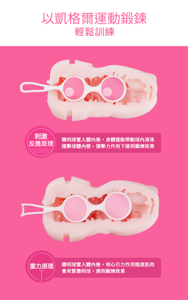每組配有4個可交替的按摩球,2個30g的粉色球和2個40g的藍色球。一開始僅佩戴一個球(配有抽繩),然後在家中走走試試感覺吧