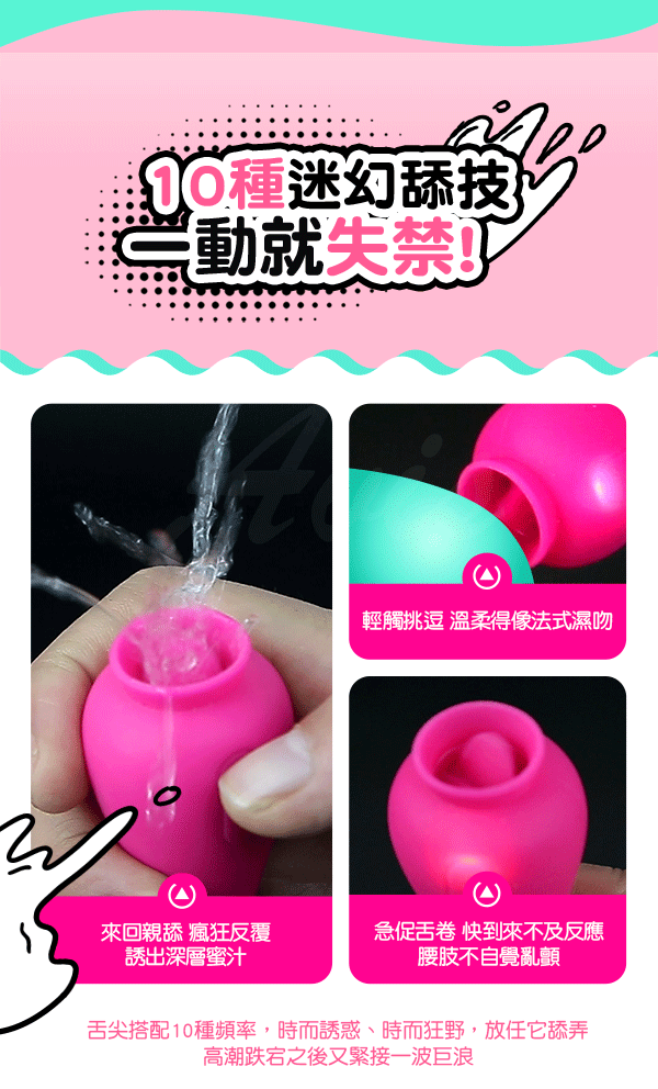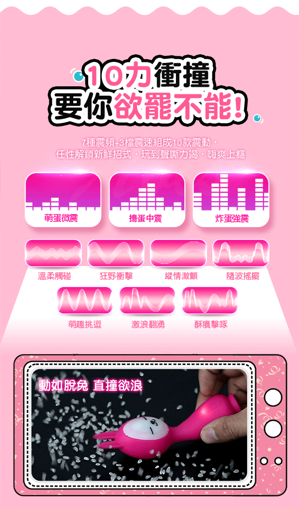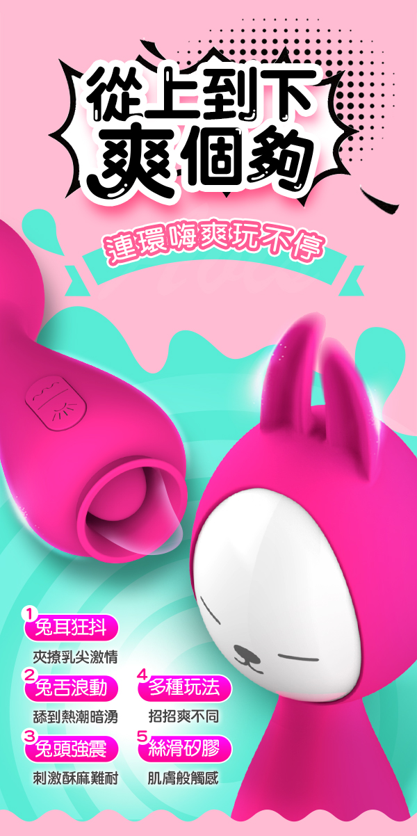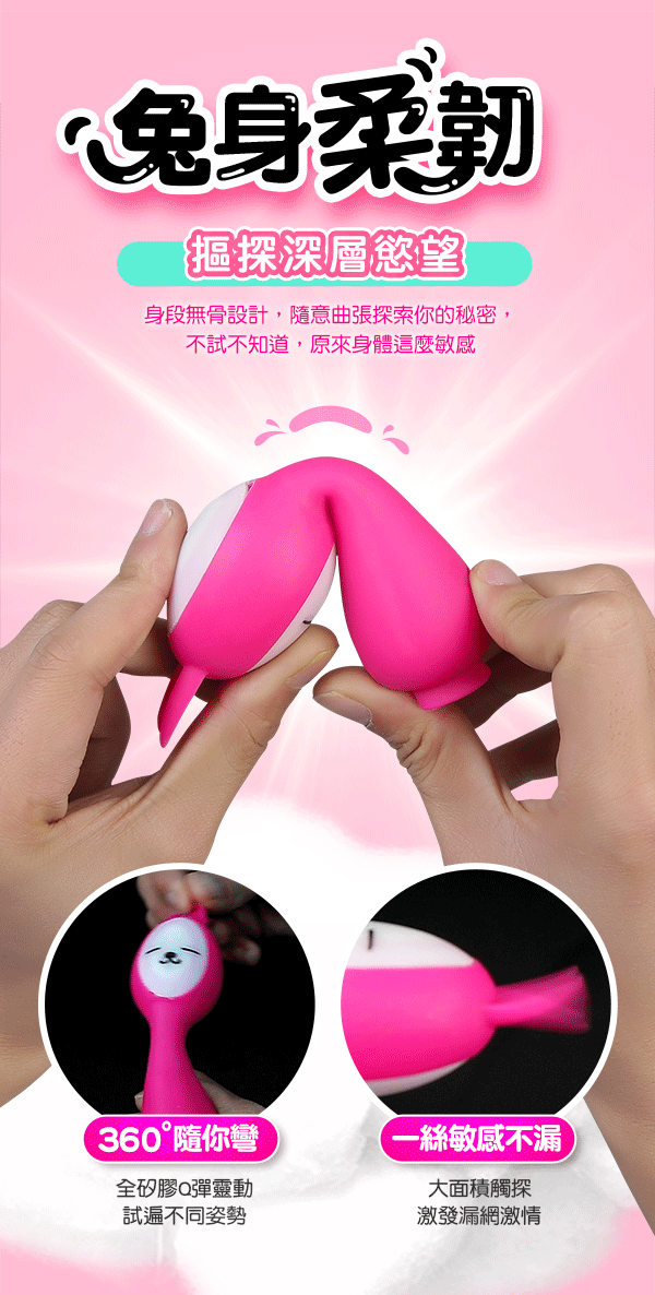 萌兔有猛招,一頭軟舌蜜舔,一頭深入激顫拍打輪番上陣,激情到難以抑制。帶著10種新鮮刺激的變頻節奏肆意探索您的身體,讓您顫慄不已。為全矽膠無骨設計,可隨意彎曲輕鬆探索身體敏感點。擁有防水低噪讓您夜夜潮來潮去都不怕,事後清洗也方便喔~