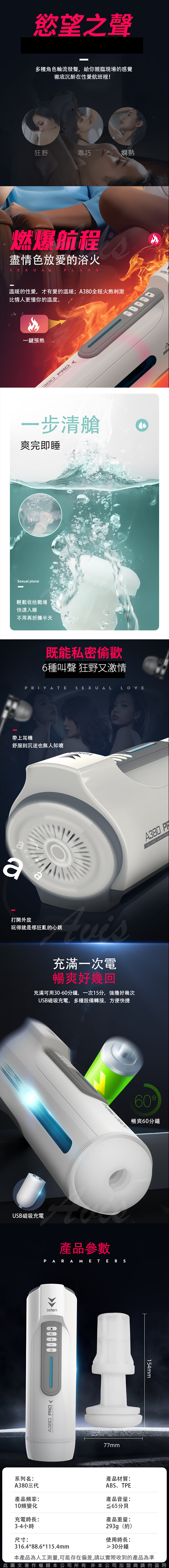 Leten-A380 3代 氣旋伸縮 叫床 一鍵加溫/爆發 全自動活塞自慰杯