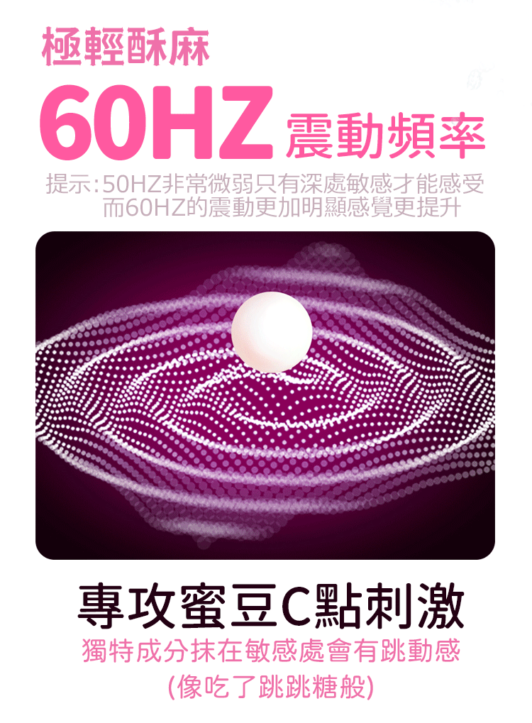 具有獨特震動感,類似跳跳糖帶給您跳動感覺,有助於女性自身分泌潤滑液。