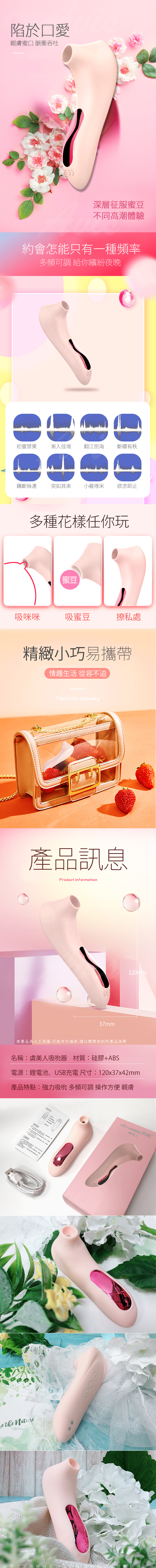 共有5段的吸吮強弱變化,主要是透過頂部開口來做吸允,通過虞美人這個小吸嘴會釋放出一陣陣聲波,讓氣流震顫動,記得搭配上潤滑液更棒!