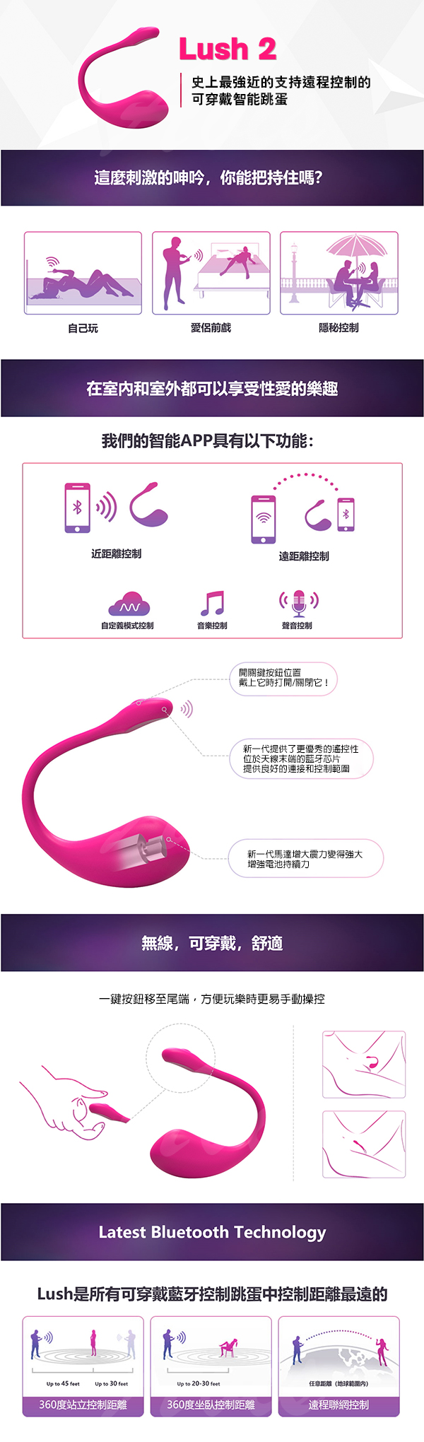 無界限的操控體驗!Lush 2 的藍芽感應器放置在按摩器尾巴的最頂部,能接收到更多更廣的信號範圍,並減低連接性不穩定的問題。
