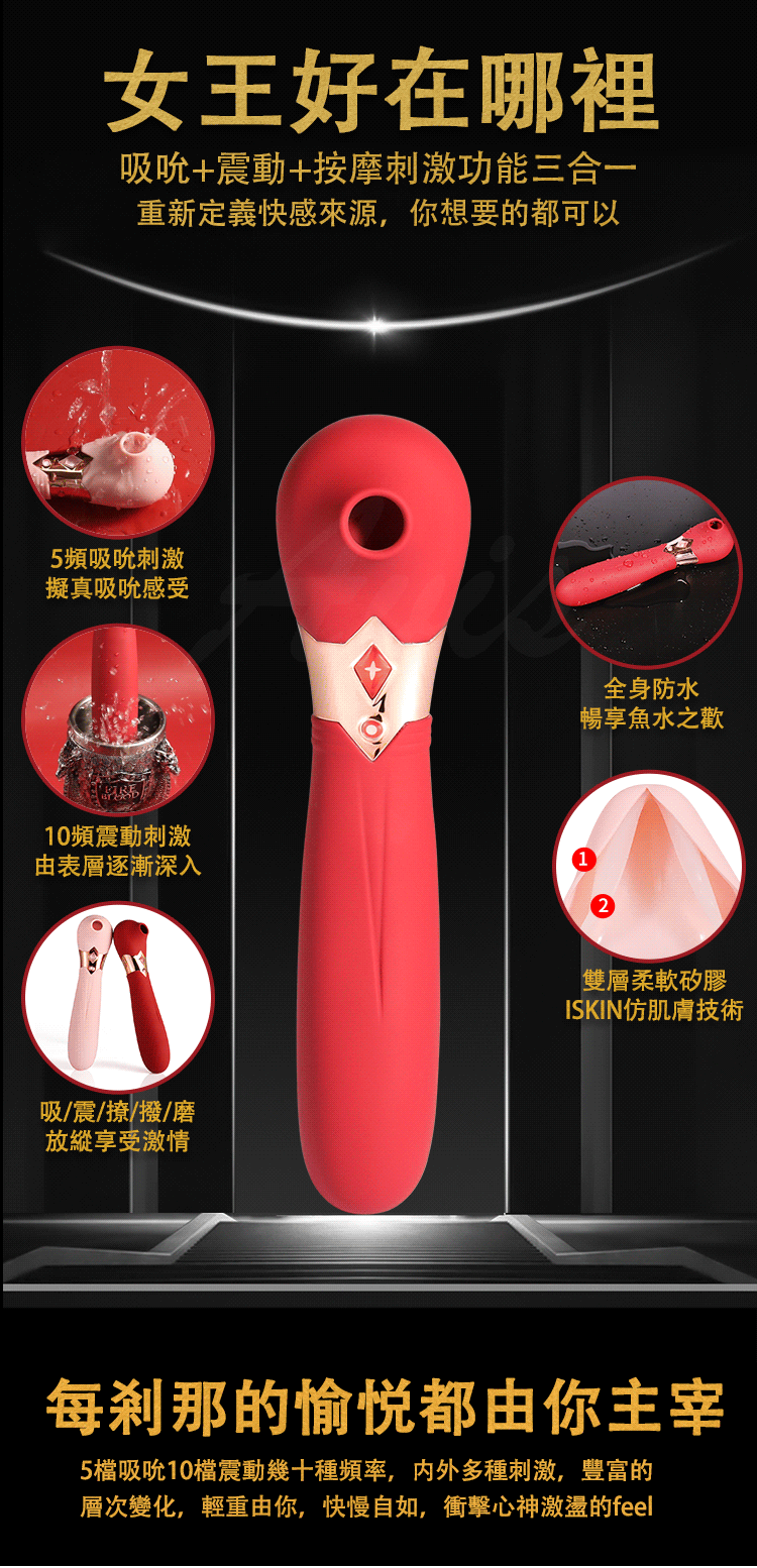 如果你想要通過刺激陰蒂體驗潮吹的神仙感覺,S4女王是你最好的選擇,她能滿足你們所有對潮吹的想像。和市面上所有吸震玩具一樣,它也是一款通過吮吸和震動來刺激陰蒂引爆高潮的玩具。但是S4女王是一款經