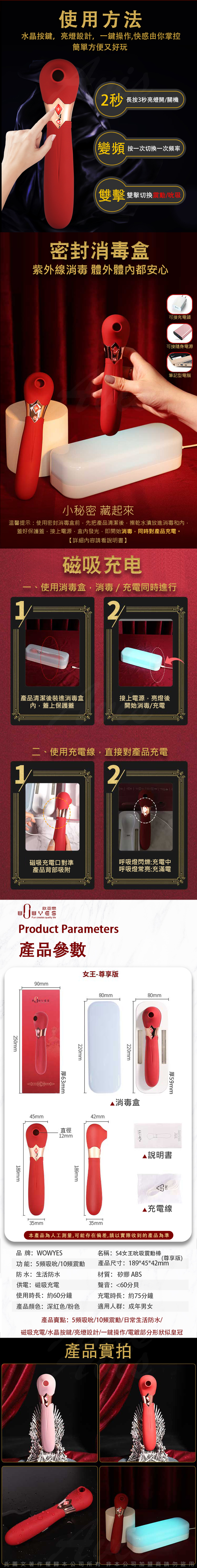 名稱:WOWYES-S4女王 5頻吸吮x10頻震動唇舌快感矽膠按摩棒-紅-尊享版