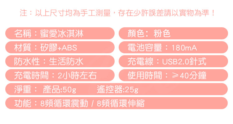 蜜愛冰淇淋無線遙控跳蛋擁有8段伸縮變頻輕鬆自邸敏感部位,刺激內外同時夾擊一同爽。無線遙控讓您一鍵在手,即使在體內也可達遙控,從此她的激情逃不出你的掌心。震動同時還全自動伸縮動力強勁,一次強有力的撞擊勝過多次慢吞吞的摩擦。此款輕鬆好入體,比手指略大一些入體毫無壓力,不撐大仙女們的嬌嫩蜜穴喔~~