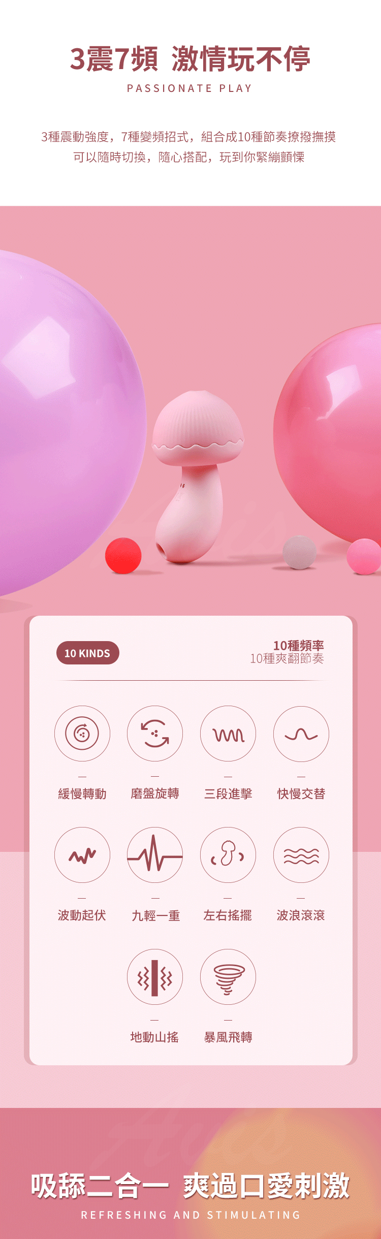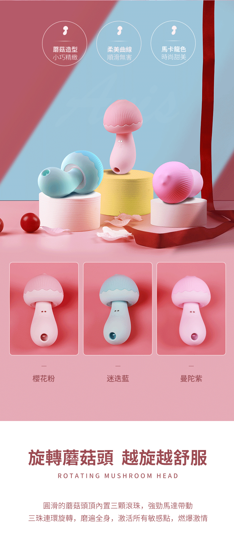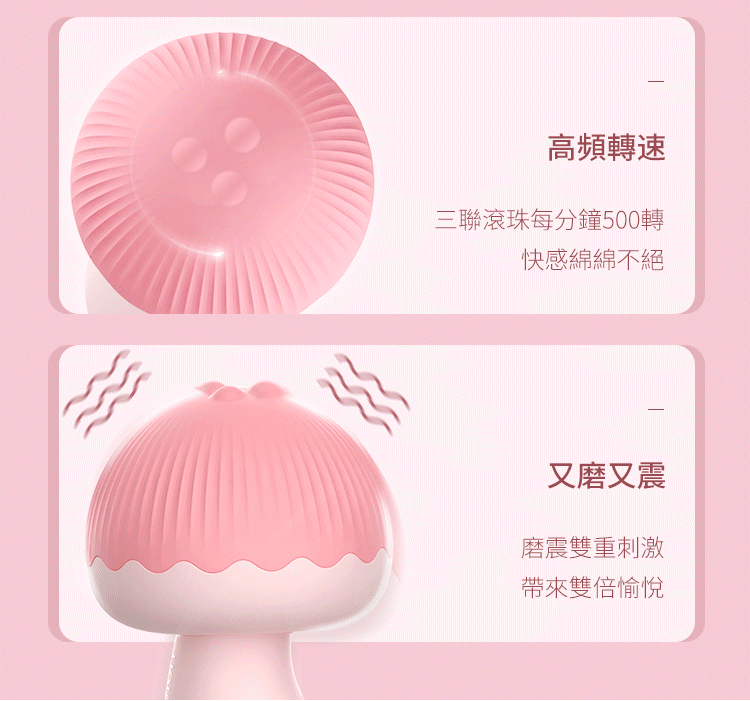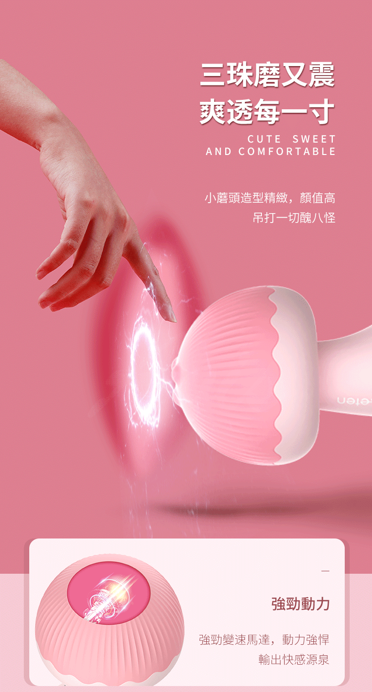 旋轉蘑菇頭,越旋越舒服,顏值天花板,一眼就淪陷。三珠磨震,三震七頻。吸舔二合一,貼合掌心快感一手掌握。