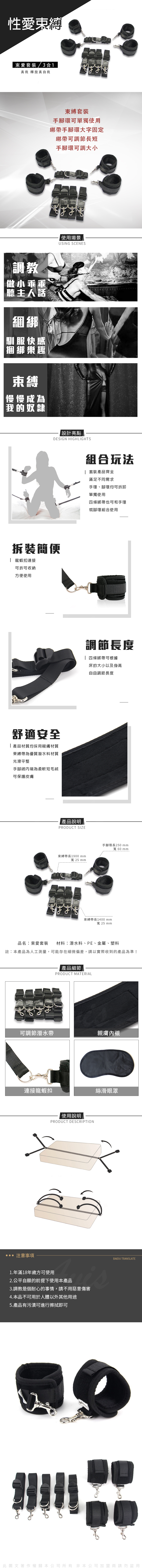 1 採用高檔PE綁帶,材質柔軟而不失硬朗,給身體很好的束縛感.緊貼肌膚,美觀舒適,能夠給伴侶帶來一種自然而然的安全快感.