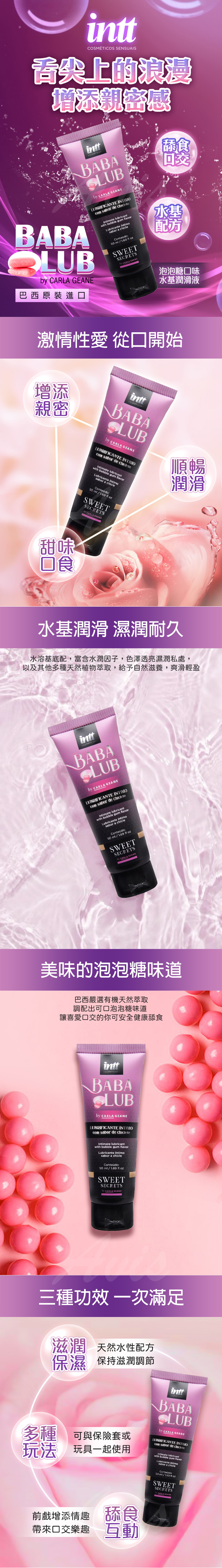 品牌:INTT品名:巴西Intt|BABA LUB泡泡糖|口交潤滑液 50ml用途:潤滑/口交產地:巴西容量:50ml對象:成年男女優點:保濕潤滑適用:用於性愛潤滑輔助添情趣保值:有效期兩年,開封後6個月內使用完畢