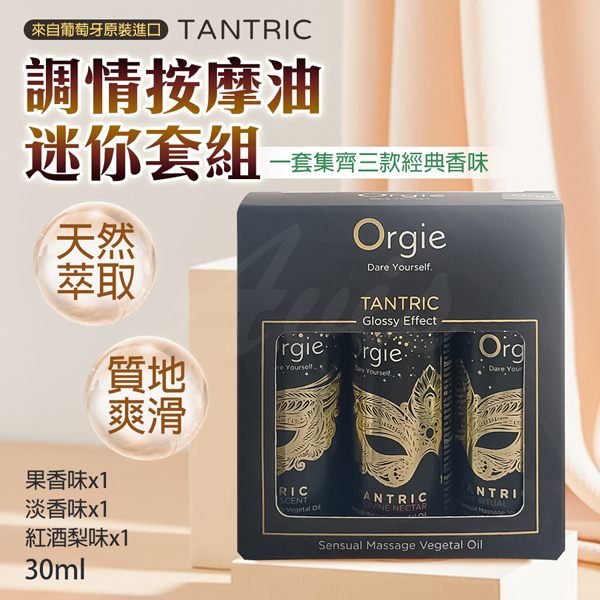 產品名稱:Orgie|Tantric Kit|情趣按摩油旅行組 30ml x3成分:甜杏仁油,香氣,紅花籽油,葡萄籽油等保存期3年,開瓶後6個月使用完