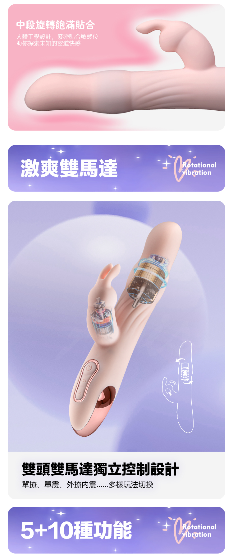 5+10種功能模式:多種震動和旋轉組合,花式潮湧,隨心選擇,讓每一次使用都充滿新鮮感。