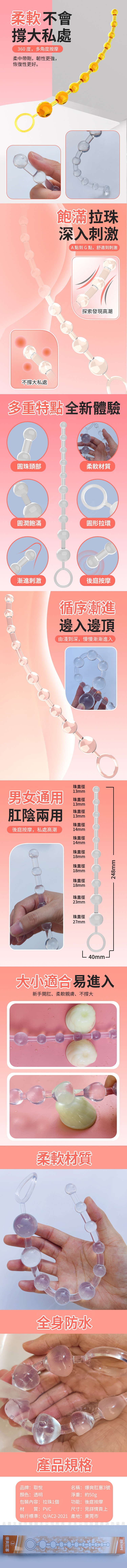 品牌:取悅 名稱:取悅|爆爽拉珠肛塞包裝內容:拉珠1個 功能:後庭按摩材 質: PVC 尺寸:見詳情頁上