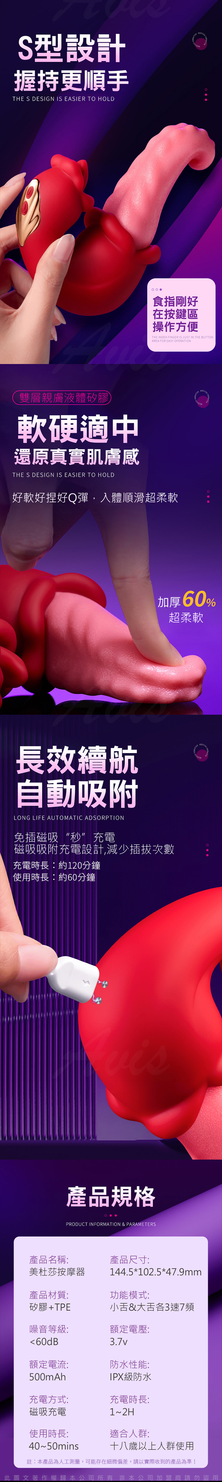 符合身體曲線的S型握柄設計,使用更順手,完美填滿蜜道,不撐大,帶來貼合舒適的私密按摩體驗。