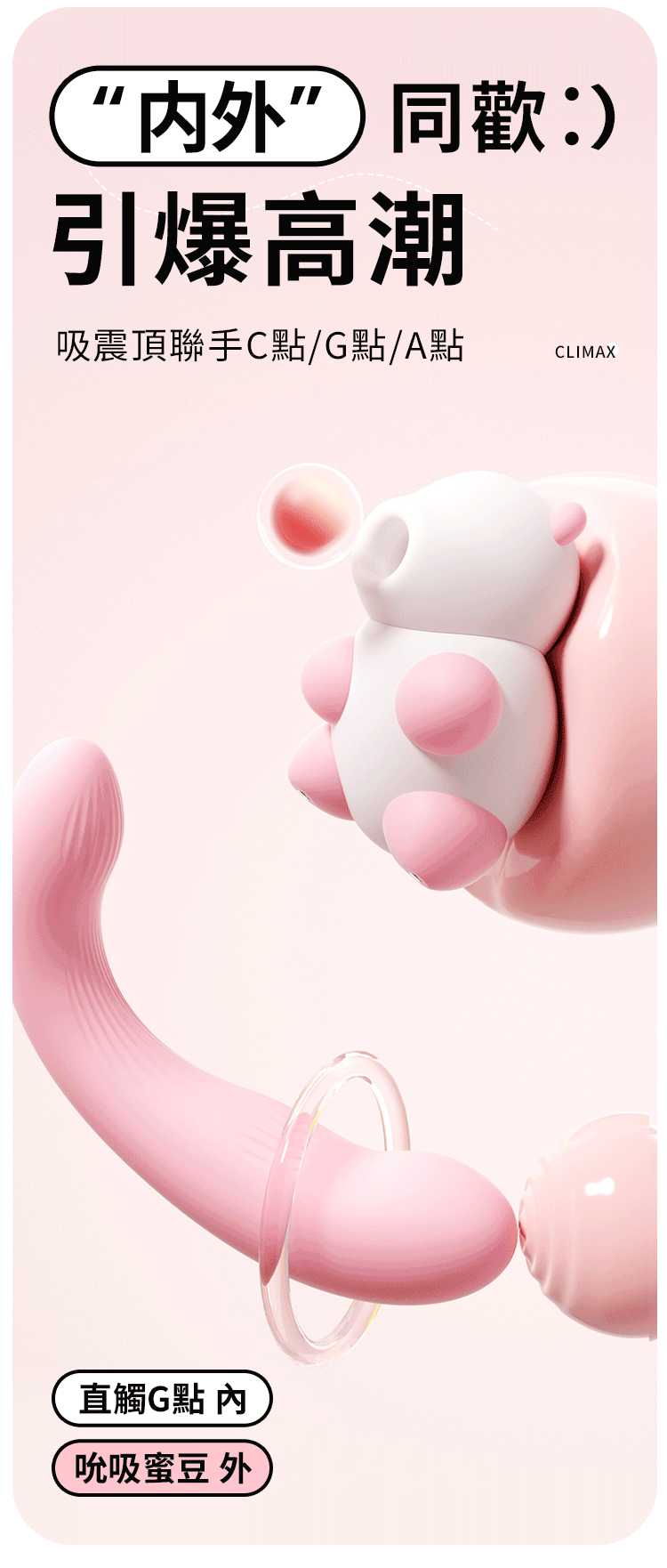 趴趴熊採用吸吮+震動雙重模式,搭載 10 頻震動變化,節奏細膩且層次豐富。整體以親膚矽膠製成,觸感柔軟安心;低於 45 分貝 的靜音表現,使用過程更自在。支援按鍵控制與小程式控制,操作靈活,滿足不同使用習慣。